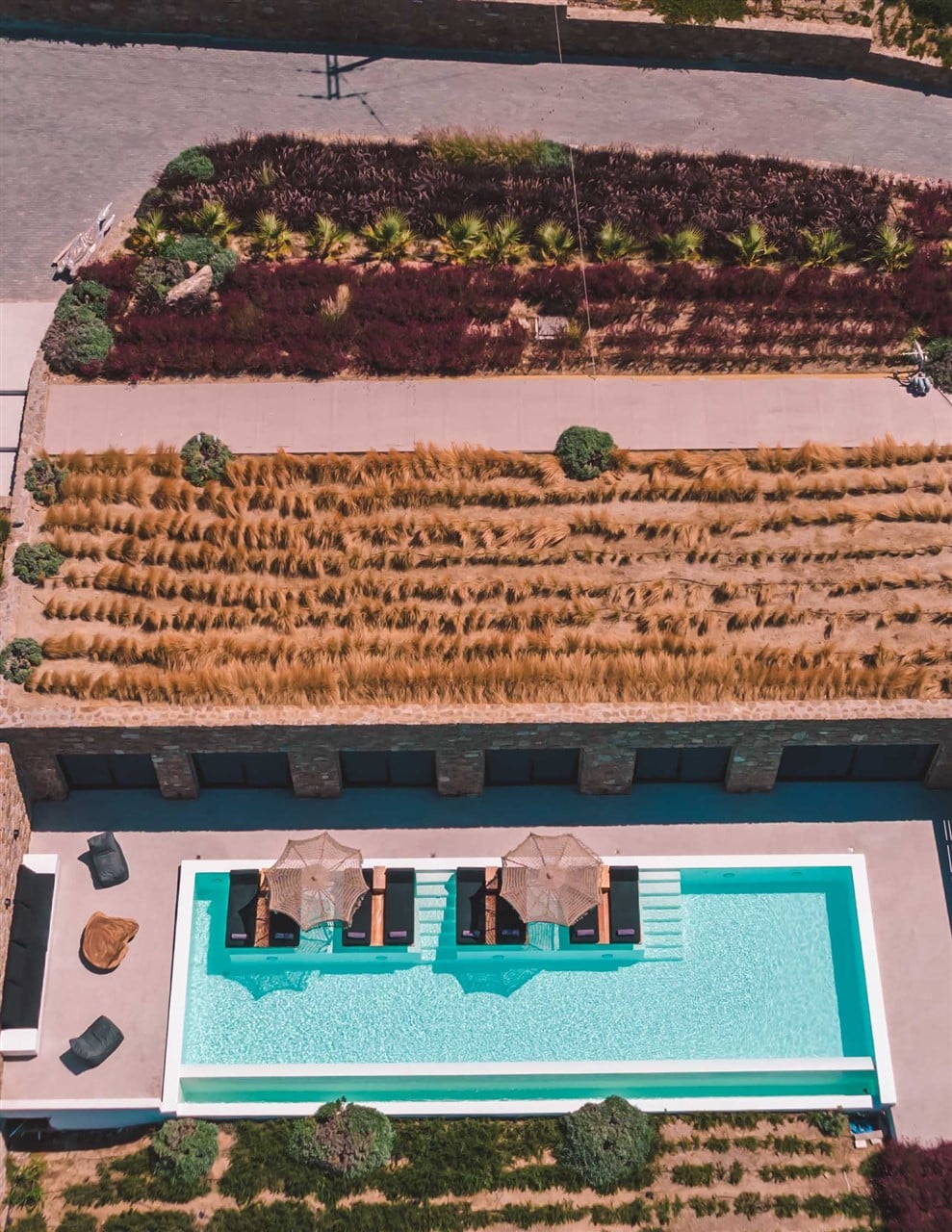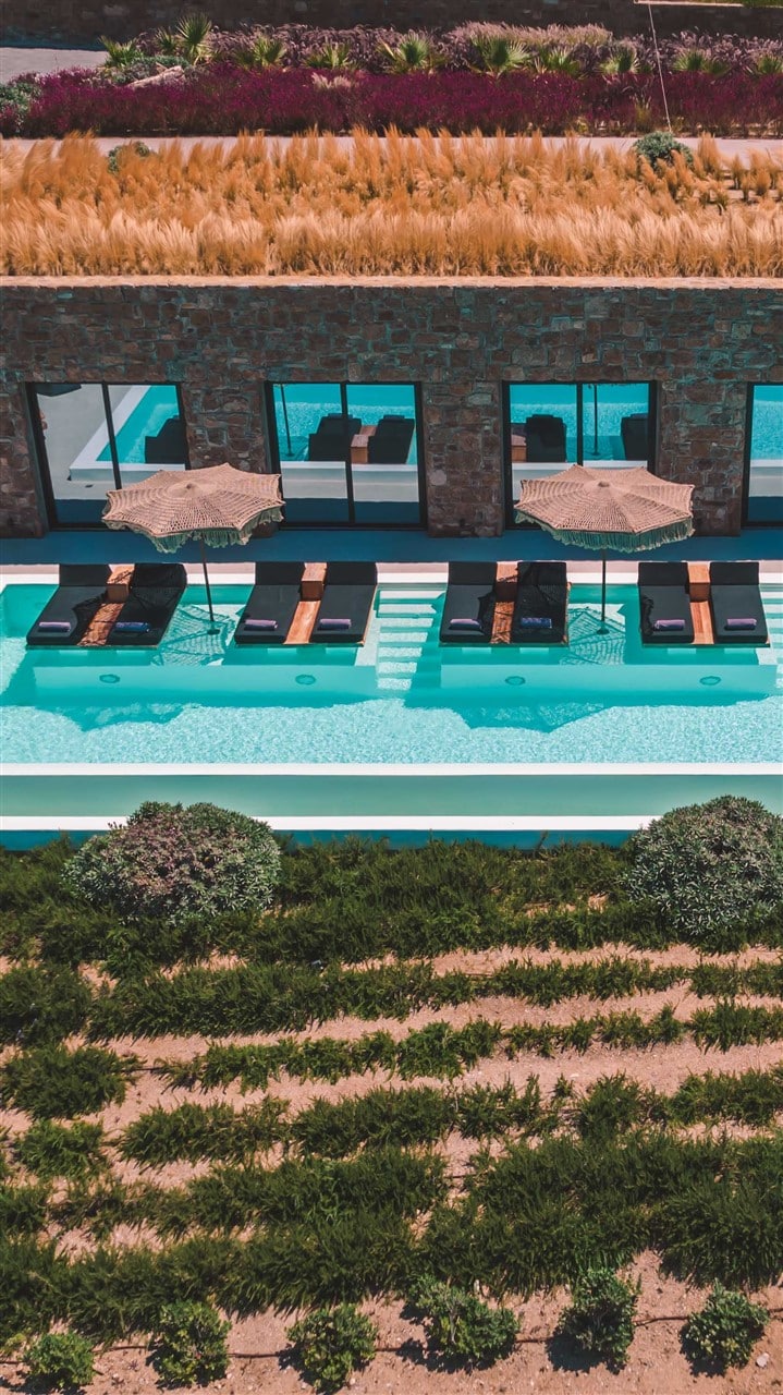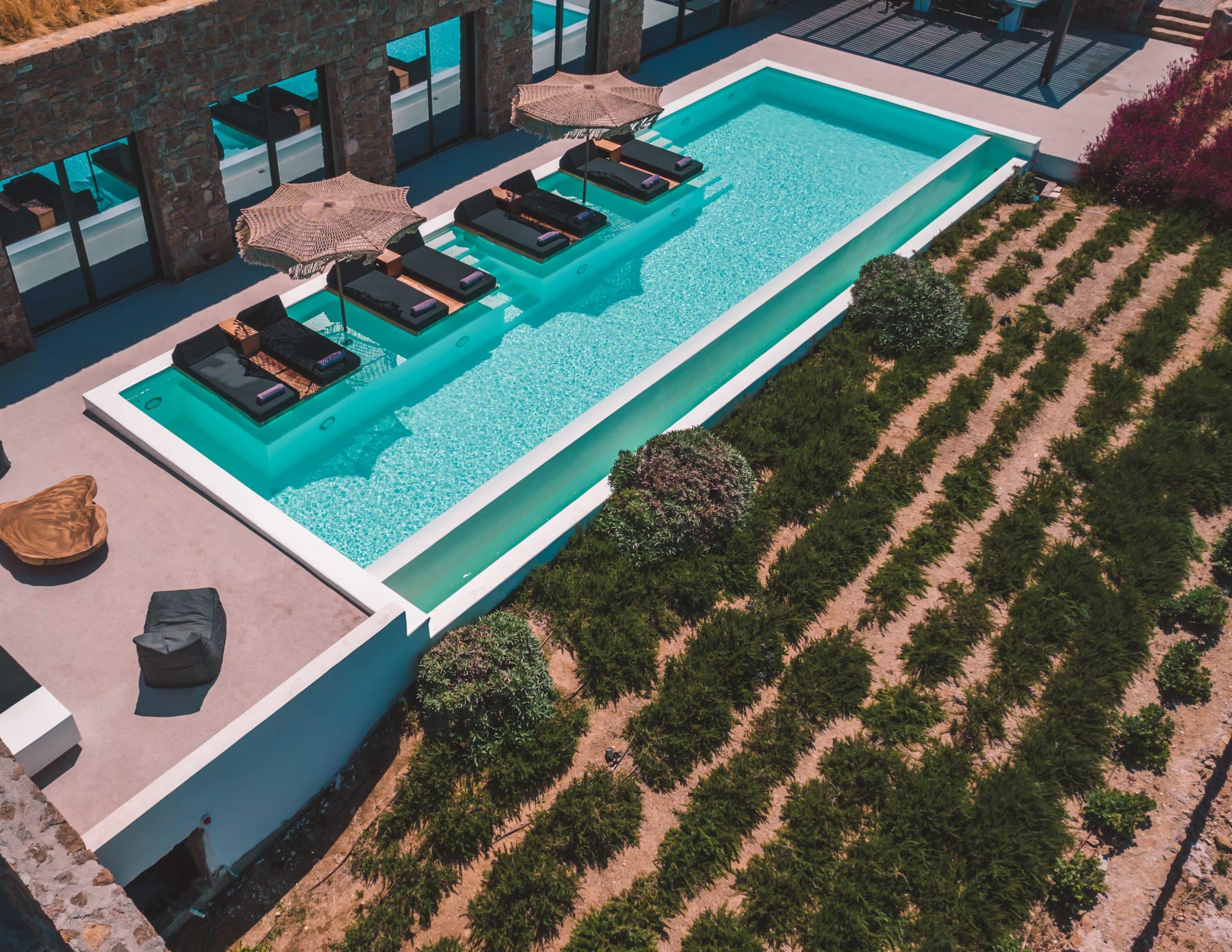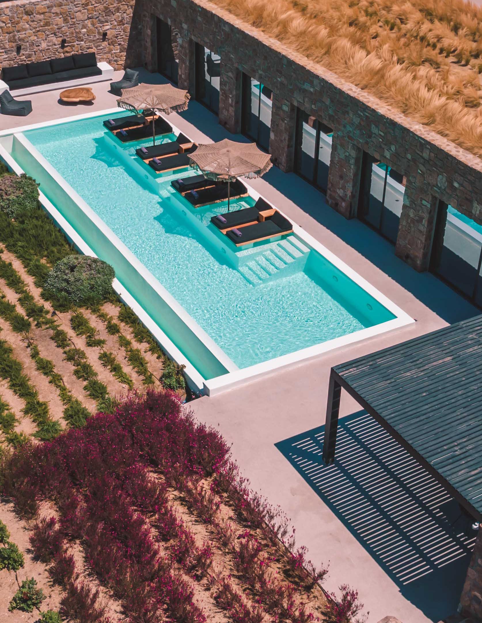 A crystal-clear pool surrounded by sun-loungers—perfect for lazy afternoons under the Greek sun.