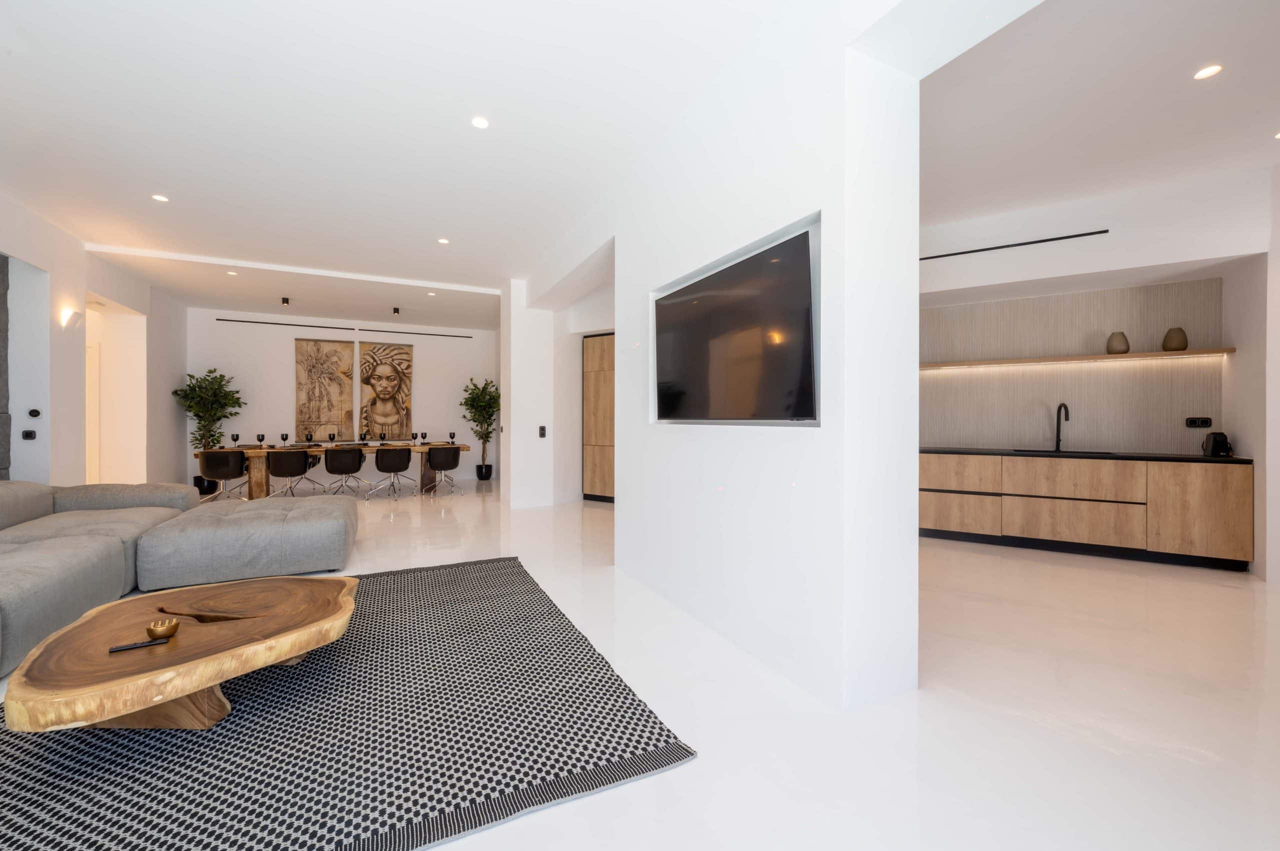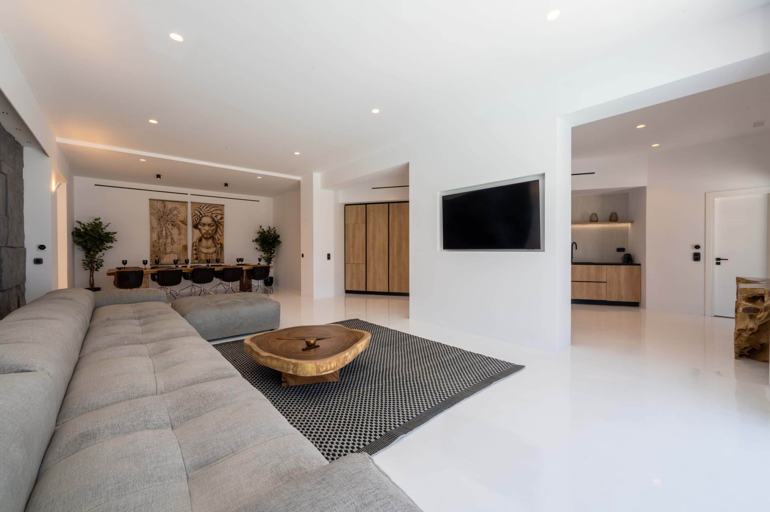 Clean lines and whitewashed walls blend seamlessly with touches of natural stone, creating an ambiance of understated elegance.